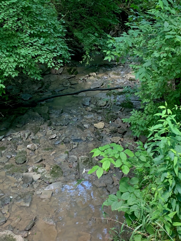 When we arrived, we stepped out of the car and the sound of gravel crunched under our shoes as we walked to the embankment to look at the creek below. A soft chorus of locusts softly sang together in tune and a singular bird calling to us echoed from somewhere in the trees. Bridget and I watched as Erin started walking. “Let me get my bearings,” Erin said as she walked to the other side of the small bridge and pointed to a tree that was forked into two. “There’s something down there,” Erin stated matter-of-factly. “I feel like something is buried down under that tree.” We stood three across and all peered over the side of the embankment in front of us.